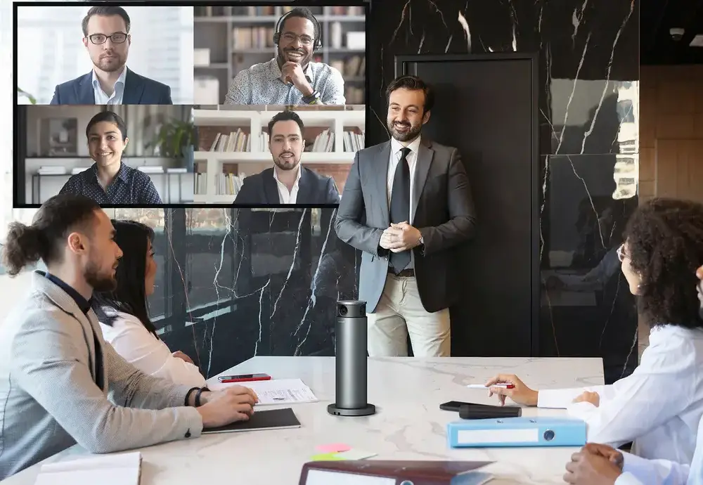 Sie bietet ein 4K-UHD-Panorama- und Nahaufnahme-Kamerasystem, das scharfe und klare Bilder liefert. Das digitale Mikrofon und der Breitbandlautsprecher sorgen für hochwertigen Ton für eine nahtlose Kommunikation. Dank integrierter KI passt sich der Kamerarahmen automatisch an die Besprechungsaktivität an, sodass keine manuellen Anpassungen erforderlich sind. Dies macht Besprechungen effizienter und konzentriert sich auf die Zusammenarbeit.